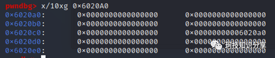 malloc之后,buf指向tcache的下一个链表,也就是我们之前埋下的伏笔0x6020A0。
