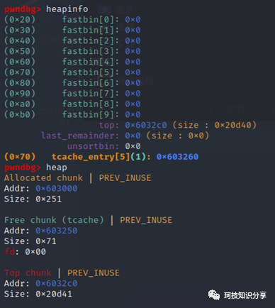 在glibc 2.26之后引入tcache机制,但只能存储7个free chunk,大于7个还是用旧的fastbin。下图是另外一个pwn题free多个chunk。