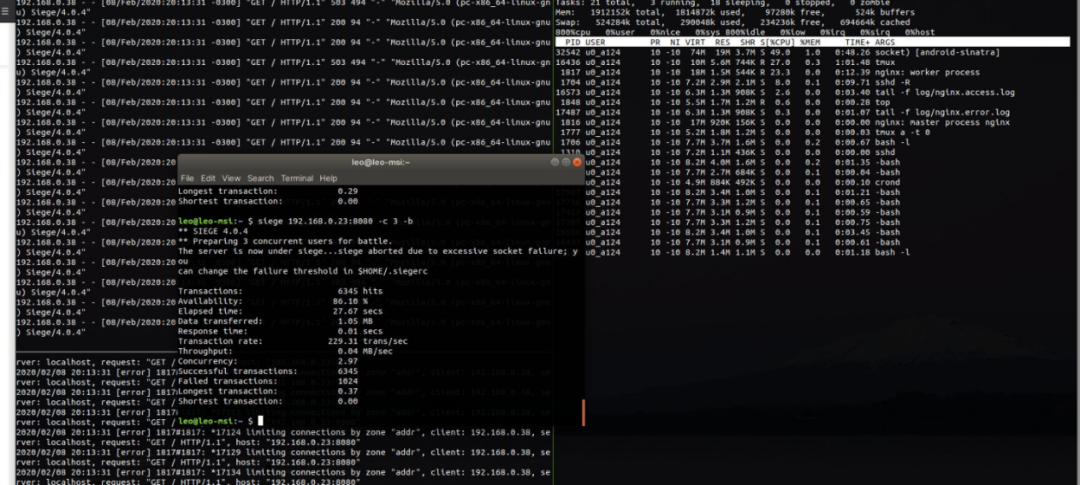 你可以用siege这个HTTP负载测试软件来模拟真实世界中的使用情况。下面是在我的服务器上运行siege的情况,服务器支持3个并发用户(真实世界中应该设置得更大):