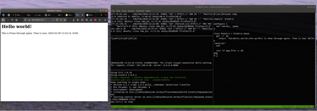 pkg install nginx接下来需要一点小技巧,才能让nginx与Puma相互配合。这个配置(https://gist.github.com/ctalkington/4448153)非常好,复制nginx.conf,将appdir改成你的Web应用的根目录。在我的配置中,我将其改成了 /data/data/com/termux/files/home/android-sinatra。
