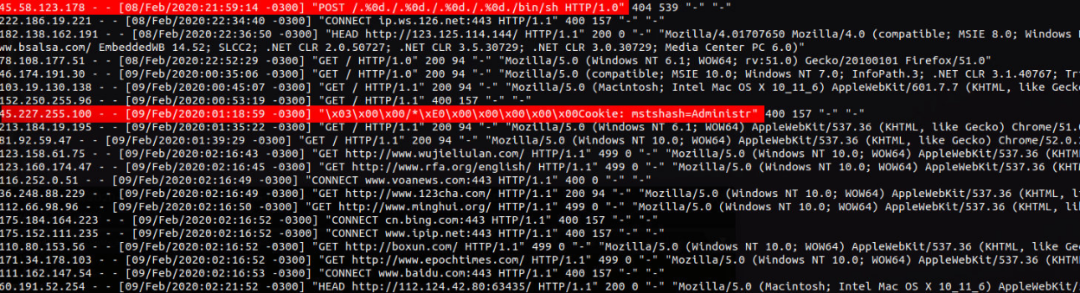 运行这台服务器几个小时后,就已经有各种爬虫进来了。大多数都是无害的搜索引擎爬虫,但有的却是来者不善,比如这两个请求: