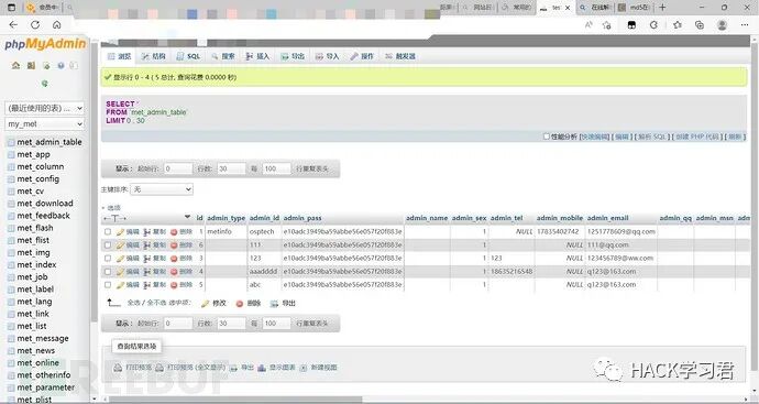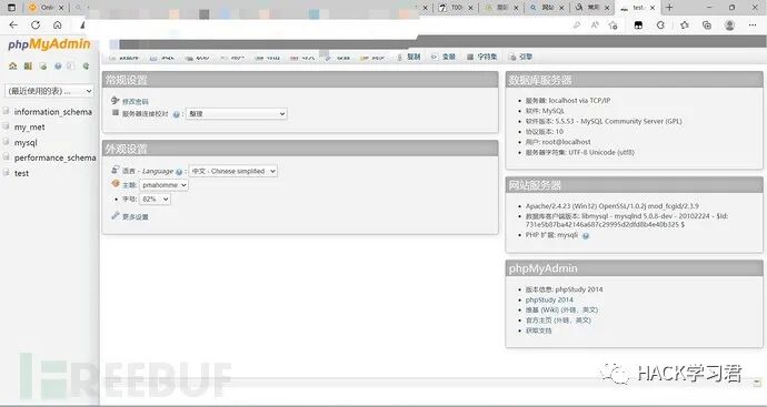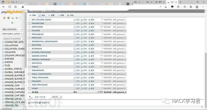 还是继续从之前的phpmyadmin着手,直接用远程登录数据库,看表,登录凭证是弱密码root/root。