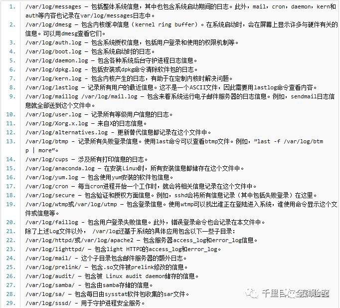 /var/log/wtmp 登录进入,退出,数据交换、关机和重启纪录,即last/var/log/lastlog 文件记录用户最后登录的信息,即lastlog/var/log/secure 记录登入系统存取数据的文件,如 pop3/ssh/telnet/ftp/var/log/cron 与定时任务相关的日志信息/var/log/message 系统启动后的信息和错误日志/var/log/apache2/access.log apache access log/var/log/message 包括整体系统信息/var/log/auth.log 包含系统授权信息,包括用户登录和使用的权限机制等/var/log/userlog 记录所有等级用户信息的日志/var/log/cron 记录crontab命令是否被正确的执行/var/log/xferlog(vsftpd.log)记录Linux FTP日志/var/log/lastlog 记录登录的用户,可以使用命令lastlog查看/var/log/secure 记录大多数应用输入的账号与密码,登录成功与否var/log/faillog 记录登录系统不成功的账号信息