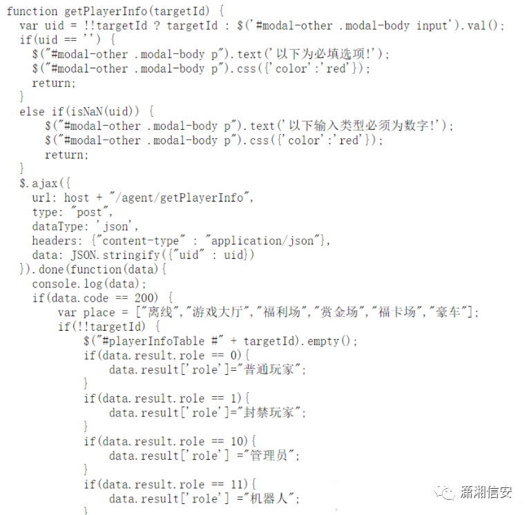$ . ajax ({url : host + "/agent/getPlayerInfo" ,type : "post" ,dataType : 'json' ,headers : { "content-type" : "application/json" },data : JSON . stringify ({ "uid" : uid })}). done ( function ( data ){console . log ( data );