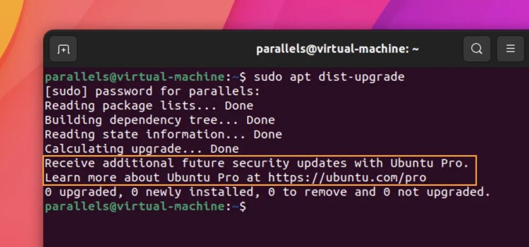 在最多 5 台设备上免费订阅 Ubuntu Pro 测试版。了解更多信息,请访问 https://ubuntu.com/pro