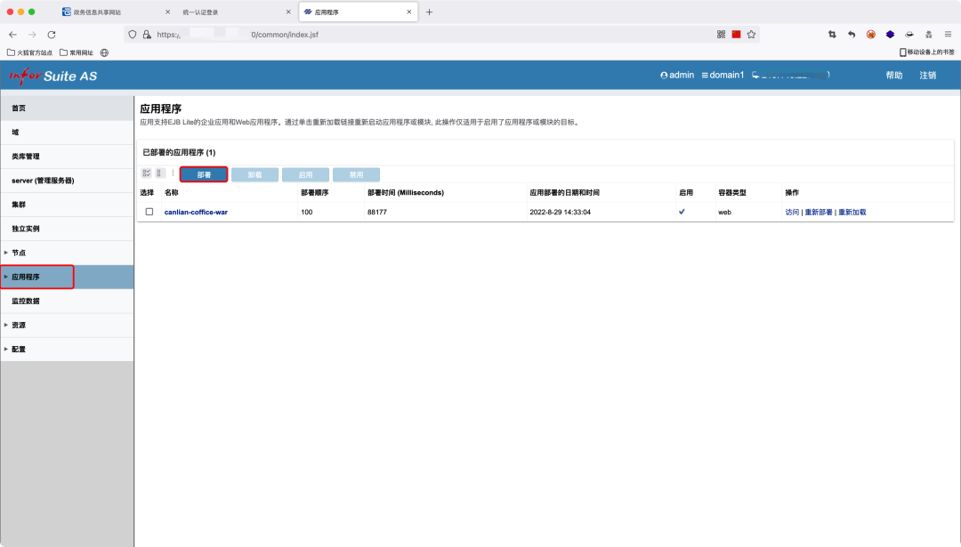 登录系统后在菜单栏点击应用程序进入应用程序功能找到部署,如下图所示。