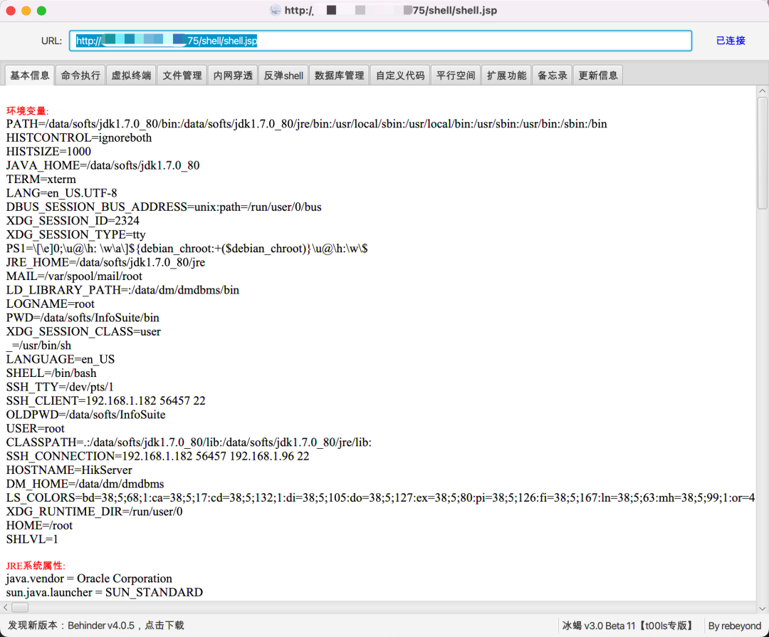 然后我通过默认口令尝试,非常幸运轻而易举的登录到了后台,这是一种胜是初恋久别重逢的感觉。这次的hw目的明确,打点拿到shell。于是对登录系统后仔细的研究了一番,发先系统部署功能与tomcat相识,可通过war包部署jsp站点,直接上马打包成war进行部署,冰蝎连接成功。