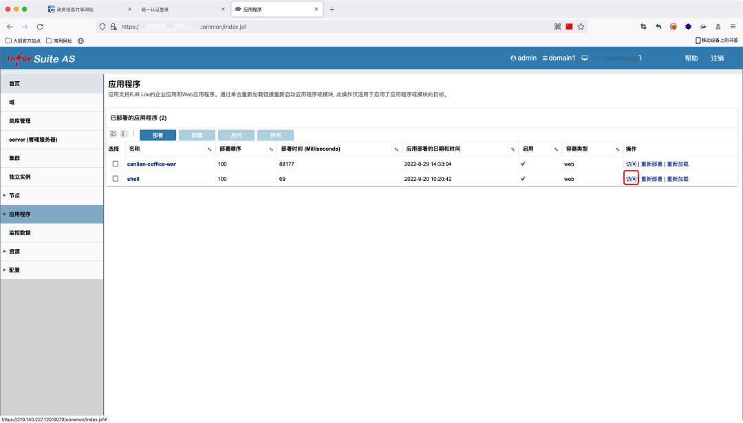 点击访问后系统跳转到下图页面,页面中给出了一个内网地址,通过改地址我们是无法访问shell的,在下图的地址中我们获取到了路径和端口,使用站点地址的域名或ip在部署后下图页面提示的端口路径下访问shell.jsp即为冰蝎的shell地址路径。