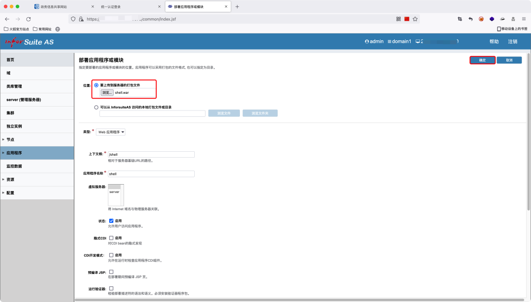 先将冰蝎jsp马在本地打包成war包,打包命令jar -cvf shell.war shell.jsp,然后在如下图中位置上传war包并进行部署
