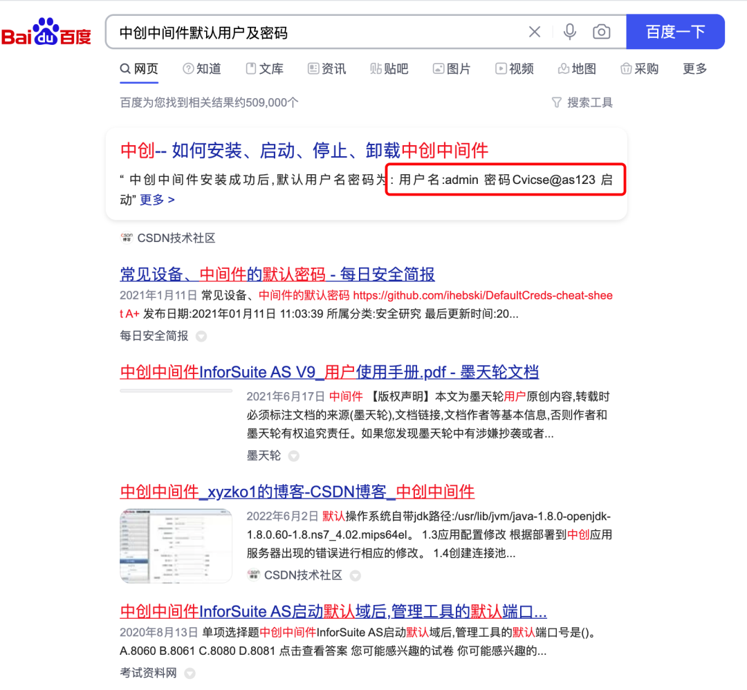 第一次遇到中创中间件是在一次渗透项目中,xx市政府部门办公系统渗透过程中通过端口扫描发现目标站点开放8060端口,访问后发现为中创中间件登录页面,第一次遇到这个中间件比较陌生猜测为国产化产品,随即手动尝试了几个弱口令未果。于是上百度查了一下,中创中间件的默认用户名密码admin /[email protected],果然默认密码安全程度还是较高的同时用了大小写数字加字符。