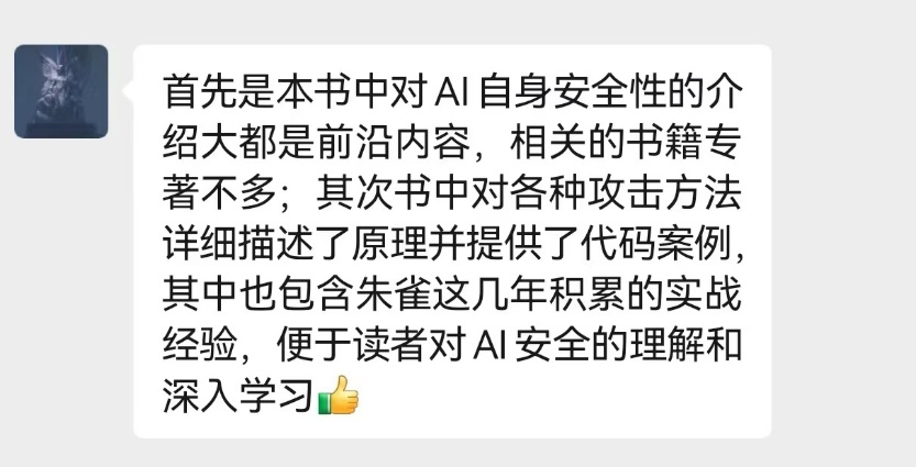 攻与防永远是螺旋式上升的态势,“AI安全”仅仅才是开始,我推荐本书给每一个安全从业者。除此之外,我一直认为最优秀的程序员一定懂得如何写出安全的代码。因此,我也推荐本书给每一位AI从业人员,一起致力于打造出安全的AI。