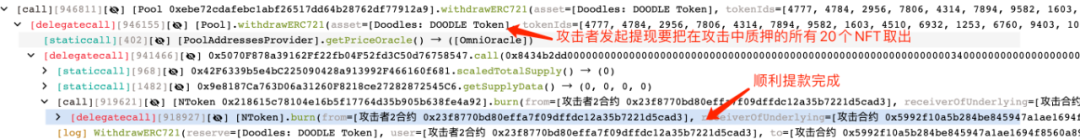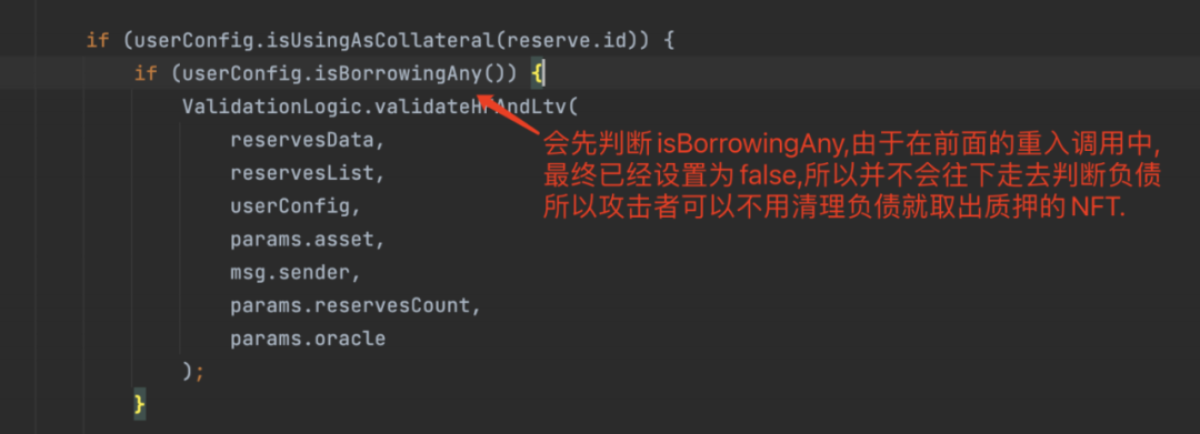 随后攻击者单独发起了一次 withdrawERC721 的操作,在提现的判断中会先检查是否有借贷的标志位再去判断负债多少,由于在之前的攻击中借贷状态已经被设置为 false,所以攻击者可以在不清理负债的情况下取出质押的 NFT。