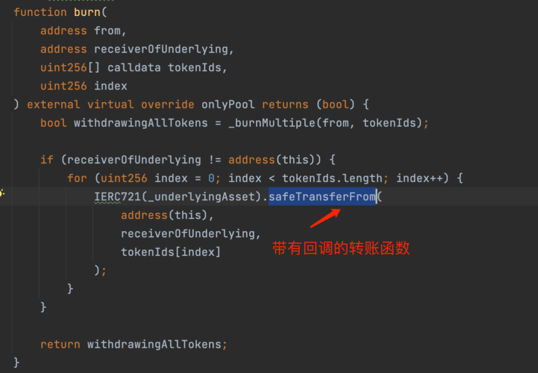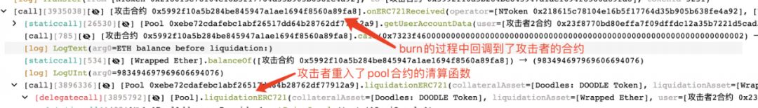 所以在进行 burn 的过程中,攻击者利用这一特性重入了合约的 liquidationERC721 函数。
