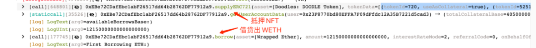 0x23F8770bd80EFFA7F09dFfdc12A35B7221d5cad3 把 20 个 DoodleNFT 转给新创建的合约后,由合约去调用 supplyERC721 抵押 NFT,获得质押的凭证 NToken, 随后调用 borrow 函数借出 12.15 个 WETH。