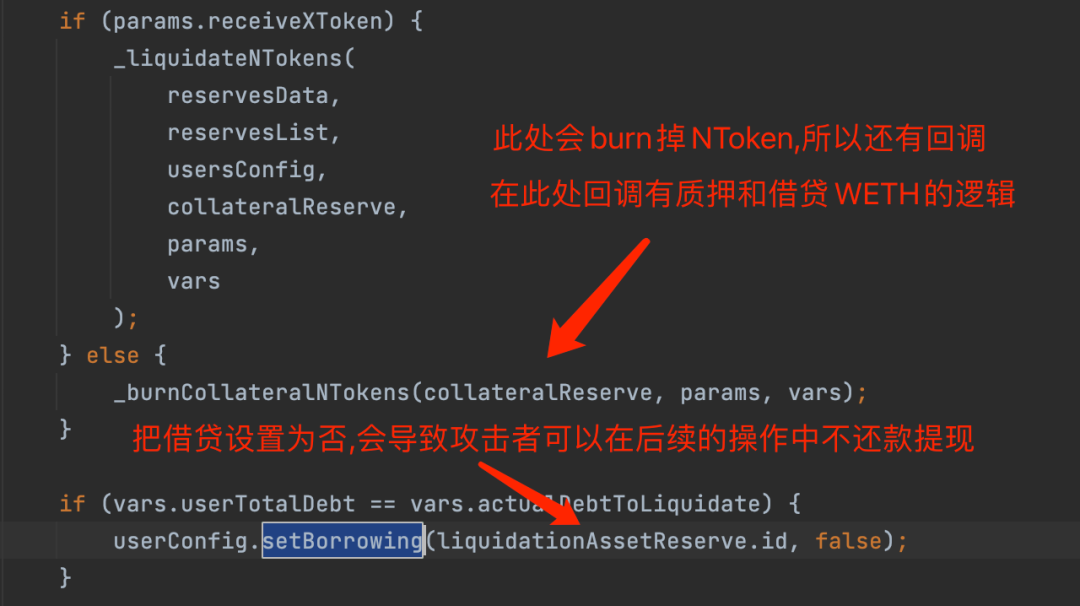 userConfig.setBorrowing(liquidationAssetReserve.id, false); 把用户的借贷状态设置为 false。