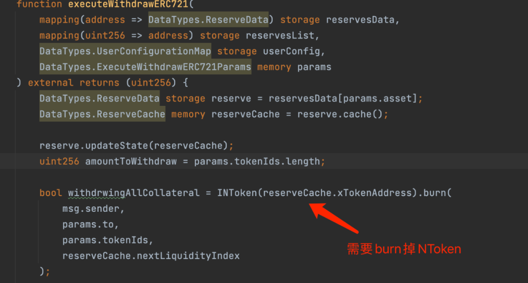 接着就是此次攻击的核心,由于在 executeWithdrawERC721 中需要 burn 质押凭证的 NToken。