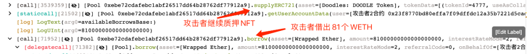 在回调中攻击者继续把所有 NFT 质押进去,并且重新借出 81 个 WETH,如果按照正常的借款逻辑合约会调用