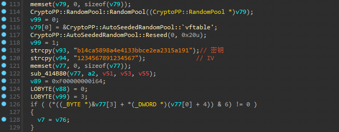 使用的是该加密库的AES算法,其中密钥为b14ca5898a4e4133bbce2ea2315a191,加密的IV为1234567891234567。