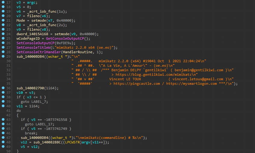 注入的mimikatz为最新版本,该项目可以从内存中提取明文密码、哈希、PIN 码和 kerberos 凭证等,摩诃草组织应该是通过 mimikatz收集密码等信息为横向移动以及持久驻留做准备。