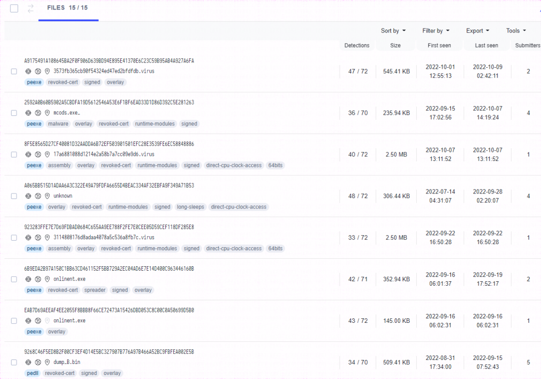 后续我们在对该签名进行持续监控中发现,摩诃草组织从6月份至今仍在使用该签名对攻击组件进行伪装,期间共有15个攻击样本被上传至VirusTotal。