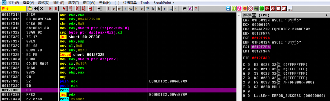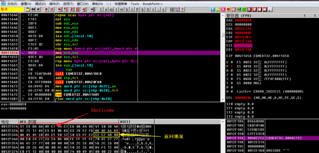 两个钓鱼文档都内置了CVE-2017-11882漏洞利用代码,通过触发Office应用中公式编辑器组件的栈溢出漏洞,从而执行指定的shellcode。