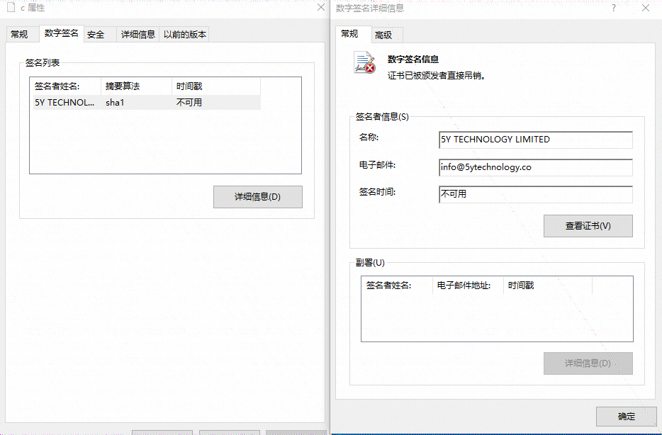 今年五月份的时候,我们披露了摩诃草组织最新的攻击活动,其中使用的攻击组件BADNEWS木马携带了被窃取的签名5Y TECHNOLOGY LIMITED,首次披露时该签名验证仍然有效[2]。在我们对该签名进行披露过后,签名颁发者将该签名进行了吊销处理。