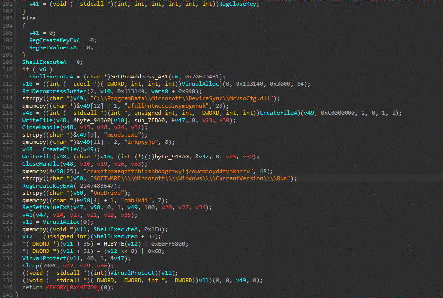 Shellcode使用动态获取的方式获取API进行调用,首先在C:\ProgramData\Microsoft\DeviceSync目录下释放隐藏的mcods.exe和McVsoCfg.dll文件,并为mcods.exe添加注册表启动项。