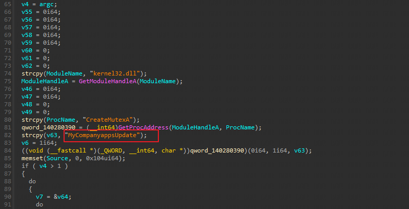 该木马在运行初期创建互斥体“MyCompanyappsUpdate”,我们在摩诃草组织的多个木马中均观察到了该互斥体。另外,样本还包含pdb路径“C:\Users\admin\source\repos\Cryptcmdpylod\x64\Release\Cryptcmdpylod.pdb”,其中“admin”用户名与我们在BADNEWS变种木马中看到的一致。