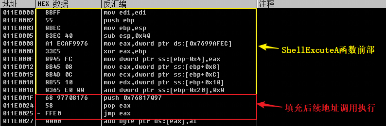 值得一提的时,在最终调用ShellExecuteA执行mcods.exe时,shellcode专门申请了一块内存空间,将ShellExecuteA函数前31位字节码拷入该空间,后经计算将将ShellExecuteA函数第32位字节码的调用地址填充在后,随后跳转到该地址执行。通过上述操作,可以绕过部分安全产品对重点API调用的监控。