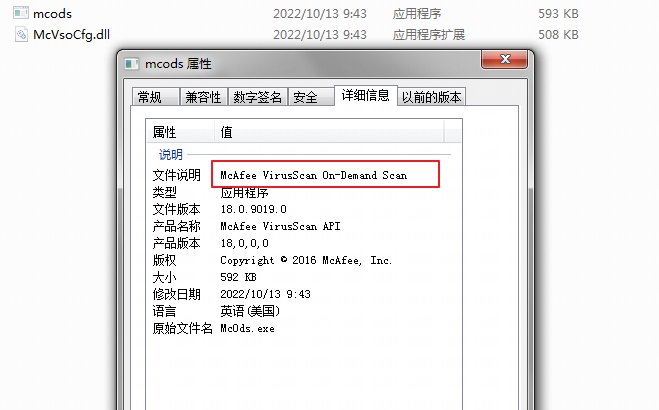 执行的mcods.exe伪装成McAfee病毒扫描组件,其pdb路径为E:\BuildEngineSpace\Temp\f3d8b4dd-f3fc-447e-85ad-7e6a57a9176f\build\Win32\Release\mcods.pdb,并且携带了被窃取的签名。