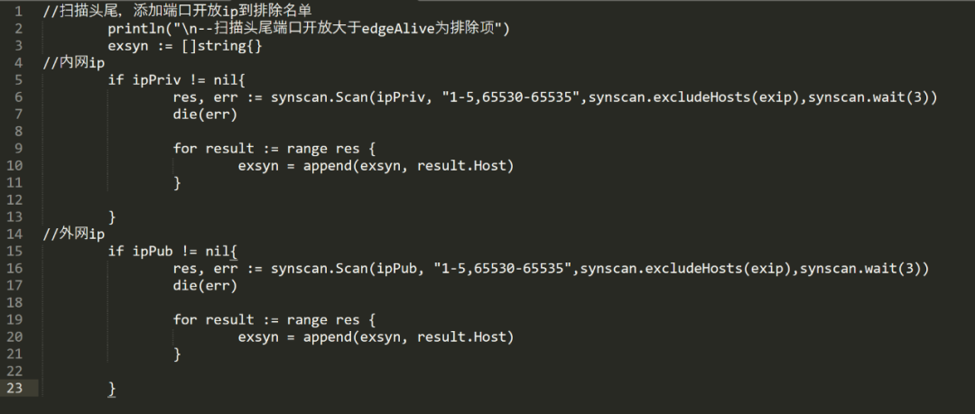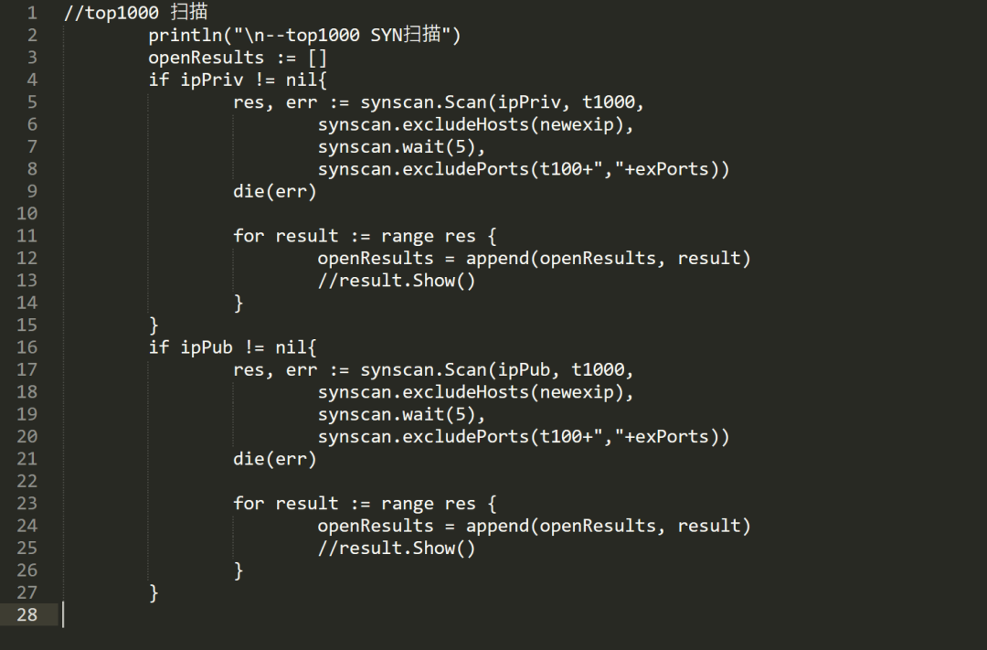 第二步是对常见端口进行SYN快速扫描。经过多次测试后,我选取了35+端口组成了top20,当top20开放数量大于配置阈值后,默认是存在防火墙端口膨胀情况。