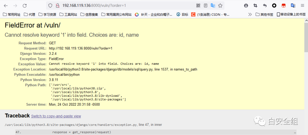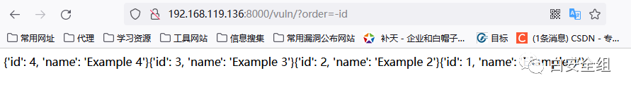 你的ip:8000/vuln/?order=1我们构造一下order=-id,这样会产生id降序的结果