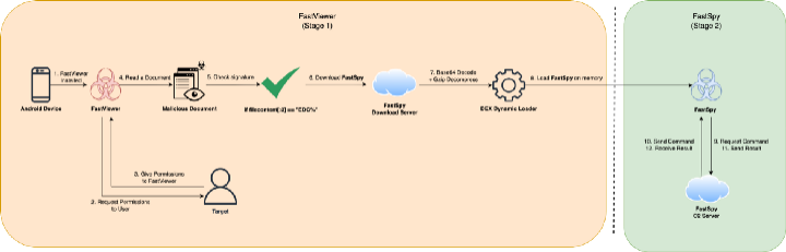 近日,S2W的威胁研究和情报中心Talon披露了具有朝鲜背景的APT组织Kimsuky,利用三种针对Android设备的新型恶意软件攻击韩国目标。这三种恶意软件分别为:FastFire,通过伪装成Google安全插件,从Google支持的应用开发平台Firebase接收命令,而不是像传统方法那样通过HTTP/S通信从C2接收命命令;FastViewer,将自己伪装成“Hancom Viewer”,这是一个移动端的文档查看程序,可以读取韩国普遍使用的韩语文档(.hwp),并在从受感染设备窃取信息后下载其他恶意软件;FastSpy,基于AndroSpy源代码开发的Android设备远程控制工具。以下是FastViewer和FastSpy的攻击链图。