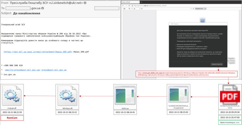 据报道,乌克兰计算机应急响应小组(CERT-UA)已就勒索团伙Cuba对其关键键基础设施的攻击发出警报。从10月21日开始,CERT-UA发现了一起冒充乌克兰武装部队总参谋部新闻处的网络钓鱼活动,网络钓鱼邮件会诱使收件人点击其中嵌入的链接,并且最终会安装ROMCOM RAT。该机构表示,考虑到RomCom后门的使用以及相关文件的其他特征,推测此次活动与Tropical Scorpius(UNC2596)有关,该团伙负责分发Cuba勒索软件。攻击过程如下图所示。