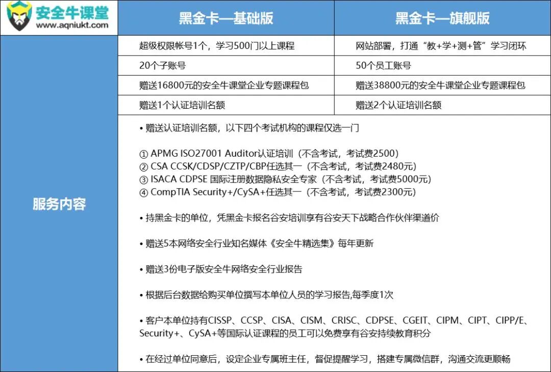 最受企业欢迎的安全牛课堂-企业黑金卡,双11劲爆福利再升级。买一年送6个月,再送一门5000元的认证培训。