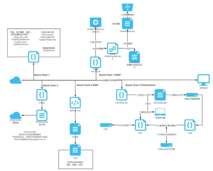 3. IMAT链,域横移&部署链,该链存在供应链攻击可能,通过安装器开启正常MATLAB安装包同时启动加载器,加载器通过创建服务启动域内横移&武器部署功能。
