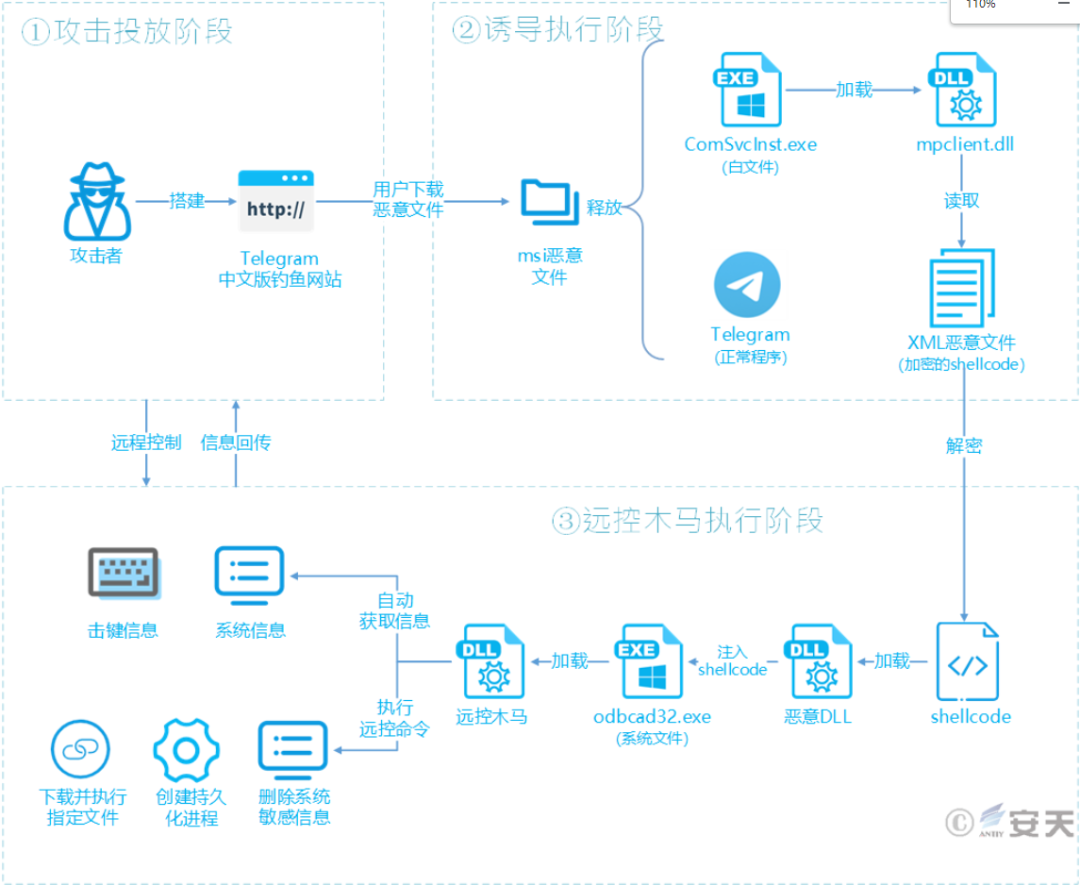 攻击者主要通过创建虚假的中文版Telegram网站,诱导用户下载包含恶意代码的Telegram应用程序安装包。恶意代码使用“白加黑”技术,通过替换DLL文件劫持合法的Windows Defender程序以躲避安全软件查杀,之后经过多层shellcode及DLL文件加载执行最终的Gh0st远控木马,实现对用户设备的远程控制。