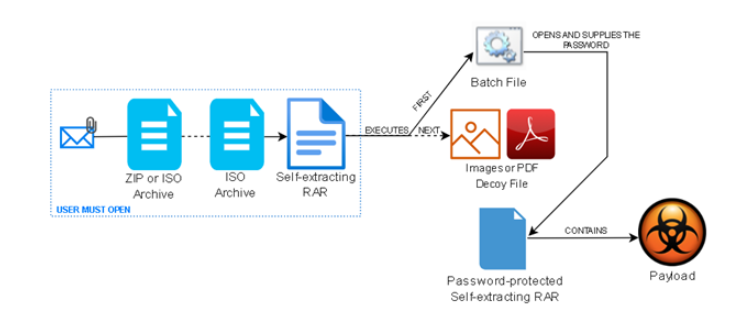 活动感染链始于以发票为主题的ZIP或ISO形式的诱饵文件,它包含一个嵌套的自解压(SFX)文档,SFX格式文档通常被攻击者用于分发恶意软件。SFX文档包含的第一个存档用于启动第二个存档,第二个RARsfx受密码保护,但是提取和执行其内容无需用户输入。此外,受密码保护的RARsfx包含一个可执行文件,它由.NET编写,并使用了ConfuserEX进行混淆,其有效负载从受感染系统的%AppData%文件夹中提取并执行。此次活动中观察到的有效载荷包括加密货币挖矿软件:CoinMiner和开源远程访问木马:Quasar RAT。