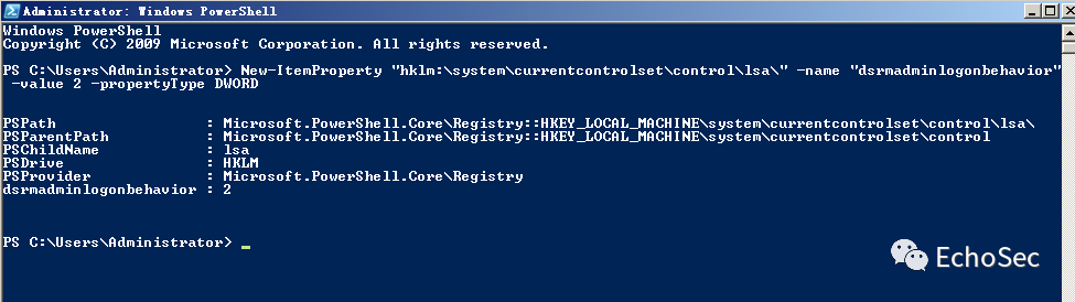 在实战中,需要注意在 Windows Server 2000 以后版本的操作系统中,对DSRM 使用控制台登录域控进行了限制。如果要使用 DSRM 账号通过网络登录域控制器,需要将该值设置为2。我这里演示用PowerShell进行修改