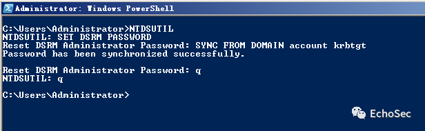 DSRM (Directory Services Restore Mode, 目录服务恢复模式)是 Windows 域环境中域控制器的安全模式启动选项。每个域控制器都有一个本地管理员账户(也就是 DSRM 账户)。DSRM 的用途是:允许管理员在域环境中出现故障或崩溃时还原、修复、重建活动目录数据库,使域环境的运行恢复正常。在域环境创建初期,DSRM 的密码需要在安装 DC 时设置,且很少会被重置修改 DSRM 密码最基本的方法是在 DC 上运行 ntdsutil 命令行工具。
