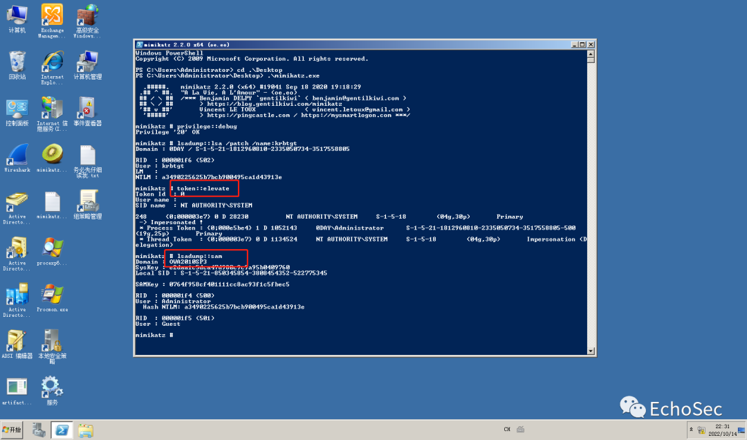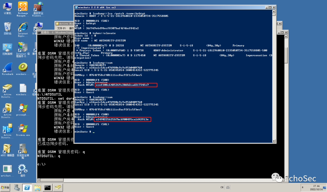 在域控中利用mimikatz查看并读取SAM文件中本地管理员的NTLM Hash