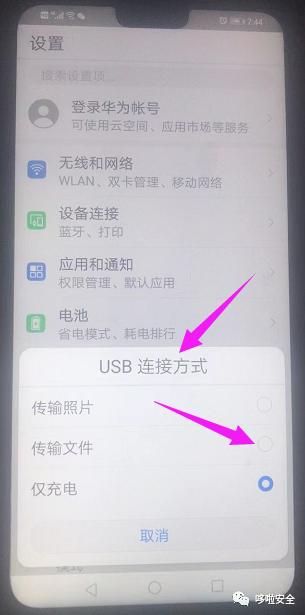 (3).Android手机上会弹出提示对话框"USB连接方式",选择"文件传输"