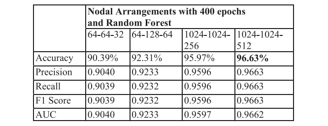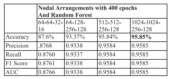 因此,进一步在深度模型中考虑了3个隐含层,下表给出了实验结果。同样可以得出隐含层数相同时节点数越多性能越好的结论。自下而上三层节点数分别设置为1024-1024-512时,四种性能指标都是最好的。同时对比上表,当隐含层数从来两层增加到三层时,准确性和AUC得分的值也更好。