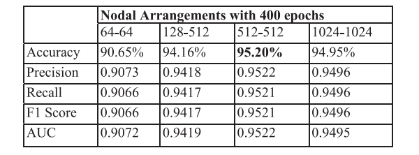 首先,深度学习模型中只考虑2个隐含层,自下而上每一层节点设置为64-64、128-512、512-512和1024-1024。从下表给出的结果来看,当有2层隐含层时,每一层设置512个节点的正确性达到95.2%,是四组实验中正确性最高的,其AUC也是最高的,达到0.85。从实验结果大致可以分析,相同隐含层数时节点数越多,性能越好。