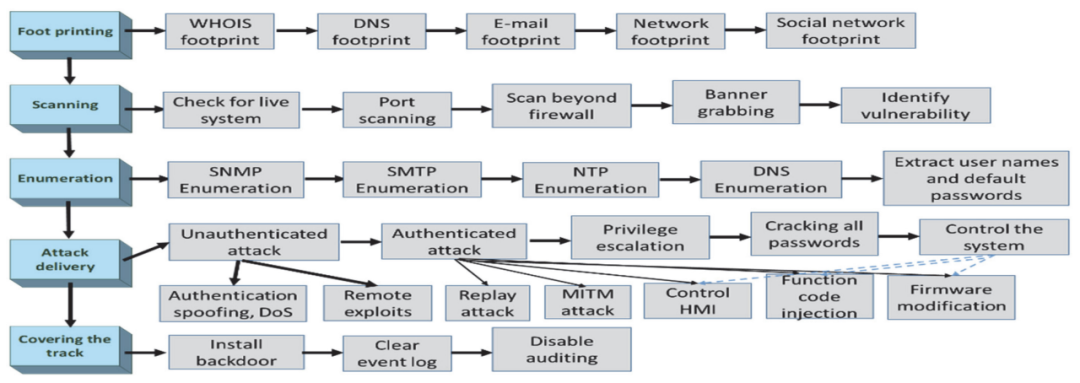图3给出了对抗IIoT网络信任边界的网络攻击所使用的的主要策略,包括攻击者的网络踩点、扫描、枚举、攻击交付和隐藏踪迹。