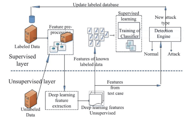 本文提出的系统模型如图1所示,是一个基于深度学习特征提取的信任边界保护模型。该模型主要分为两层:上层为监督层、下层为无监督层。在监督层,对具有标记的样本进行学习,训练一个有监督的分类器,该分类器在检测引擎中使用,以判断网络中的测试样本是正常样本还是攻击样本。由于攻击模式的快速变化,在响应时间范围内人工贴标签是不可行的,从而很难在传统的边界保护引擎中融入新攻击模式的知识。为此,本文使用无监督深度学习模型提取没有标签的新模式中的特征和变化,并将该模型与已经标记的数据结合形成一个半监督模型。